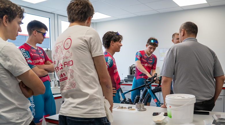 Afterward, the athletes were given a tour of the lab, including a live demonstration. With a wink, Patrick Lechner noted that the athletes also run a “mini-lab” in their daily lives—for example, when precisely mixing their carbohydrate drinks. As a token of appreciation, team shirts were exchanged.