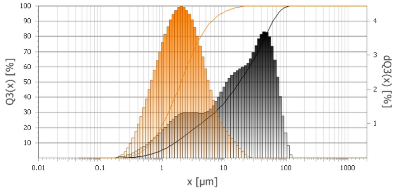 Obtained particle size with the Mortar Mill PULVERISETTE 2 after 30 minutes of grinding (black curve) and achieved particle size of the Planetary Micro Mill PULVERISETTE 7 premium line after grinding 5 minutes (yellow curve).
