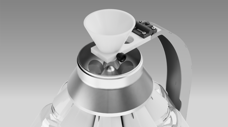 The sample feed funnel of the LABORETTE 27 guides the sample material centred onto the point of the rotating cone. The rapid rotation of the entire system accelerates the sample material outwards along its surface and divides it through up to 30 guiding channels into chemically and physically precisely identical subsamples. Your advantage: greatest division precision during sample division for the best possible accuracy and representative samples. For the division of liquid samples, the funnel is simply repositioned for eccentric division.
